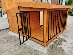 A kutyaház és a terasz belmagasságát 10 cm-rel megemeltük az alapmodellekhez képest, így a nagyobb kutyák is kényelmesen elférnek. A fedett terasz alapterülete pedig megegyezik a ház méretével – ez különösen kényelmessé teszi a használatát.