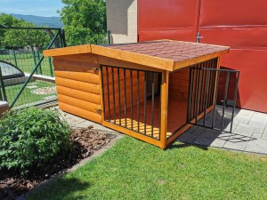 Masszív, rönkhatású borítás, teljes körű szigetelés és zárható fémrácsos terasz – ez a modell mindent tud, amit egy modern, jól átgondolt kutyaháznak tudnia kell.