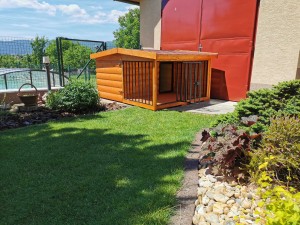 Masszív, rönkhatású borítás, teljes körű szigetelés és zárható fémrácsos terasz – ez a modell mindent tud, amit egy modern, jól átgondolt kutyaháznak tudnia kell.