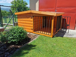Masszív, rönkhatású borítás, teljes körű szigetelés és zárható fémrácsos terasz – ez a modell mindent tud, amit egy modern, jól átgondolt kutyaháznak tudnia kell.